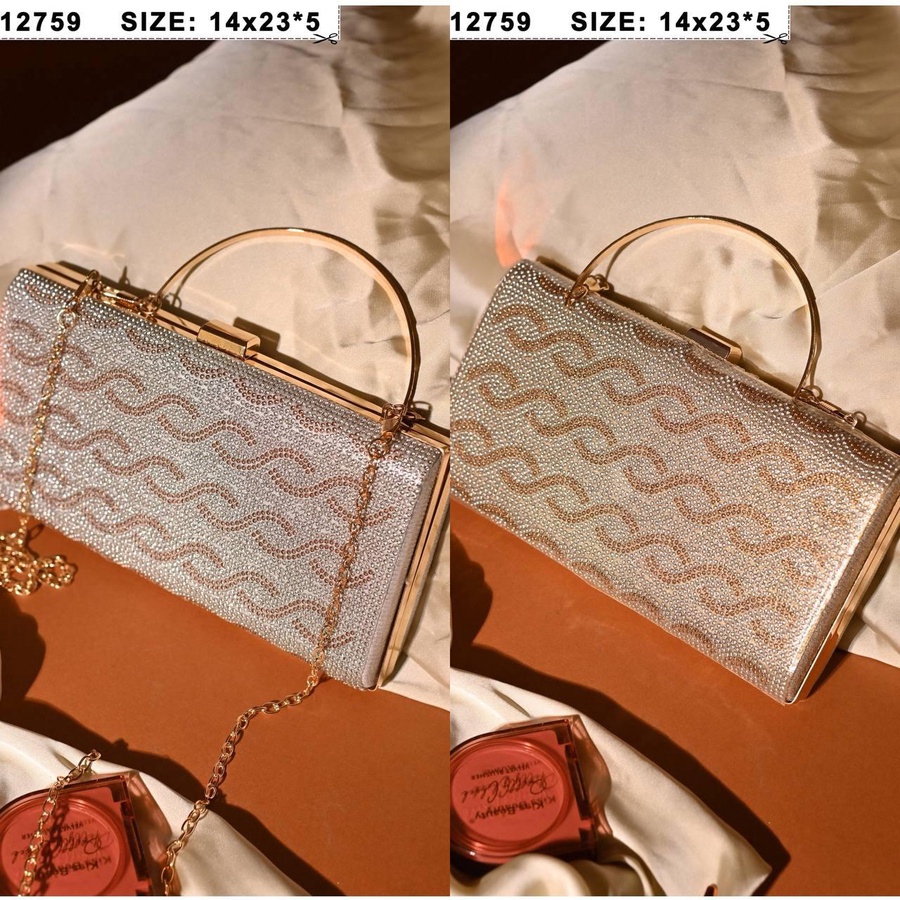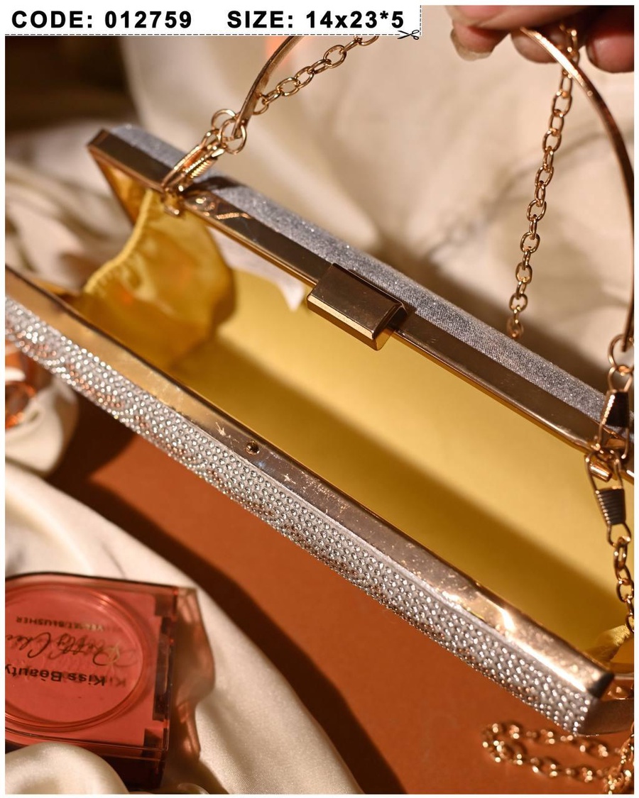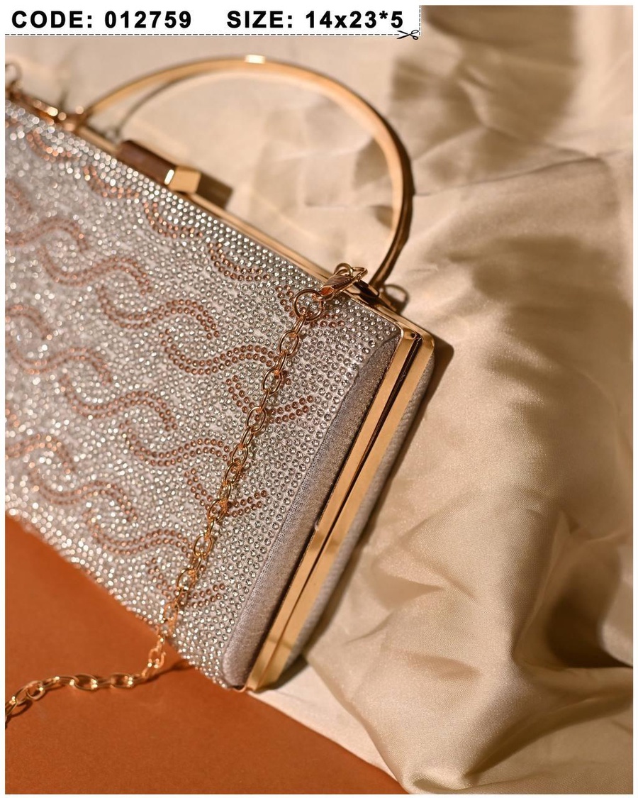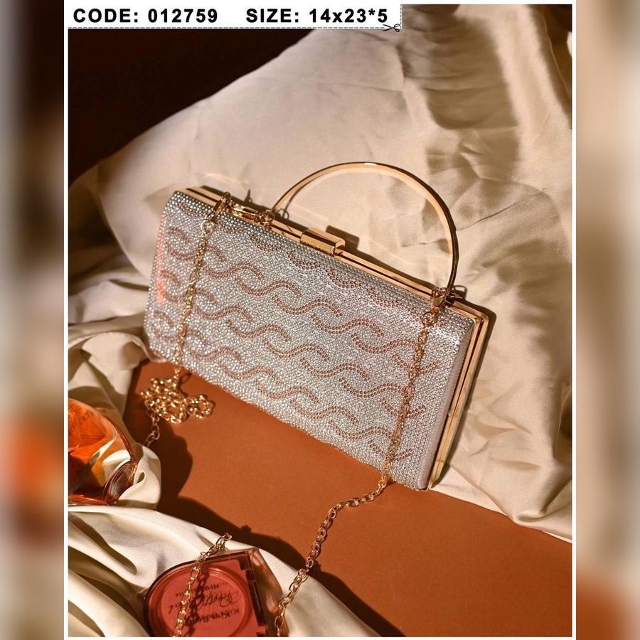 شنطة سواريه فاخرة بتصميم أنيق مرصع بالكامل بالستراس اللامع مع تفاصيل روز جولد تضيف لمسة من الرقي والفخامة. تصميمها المميز بنقوش انسيابية يجعلها قطعة ملفتة تناسب السهرات والمناسبات الخاصة.