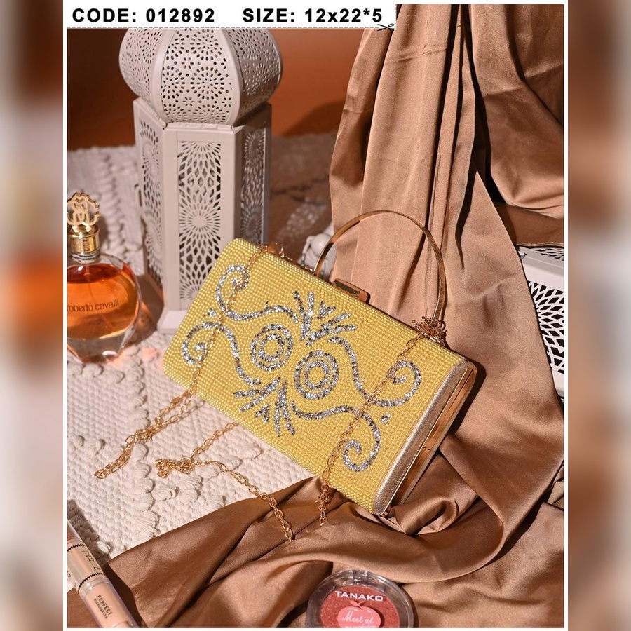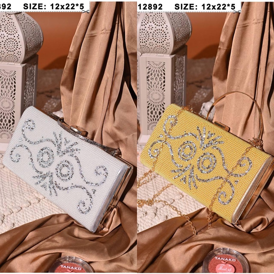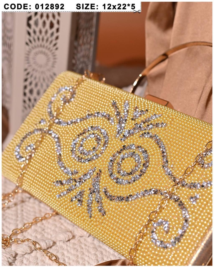 شنطة سواريه فاخرة بتصميم مرصع بالكامل مع نقوش زخرفية لامعة تضيف لمسة أنثوية راقية. متوفرة بلون أبيض كلاسيك ولمسة صفراء جريئة تناسب الإطلالات المختلفة.