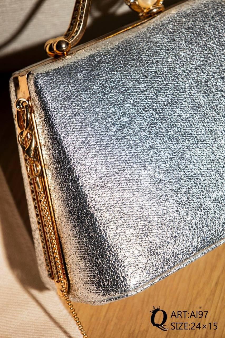 شنطة سواريه أنيقة بتصميم فضي لامع يضيف لمسة فخامة ورقي لأي إطلالة. تتميز بشكل راقٍ وعصري مع إطار ومقبض ذهبي أنيق، مما يجعلها اختيار مثالي للأفراح، الخطوبة، والسهرات الخاصة.