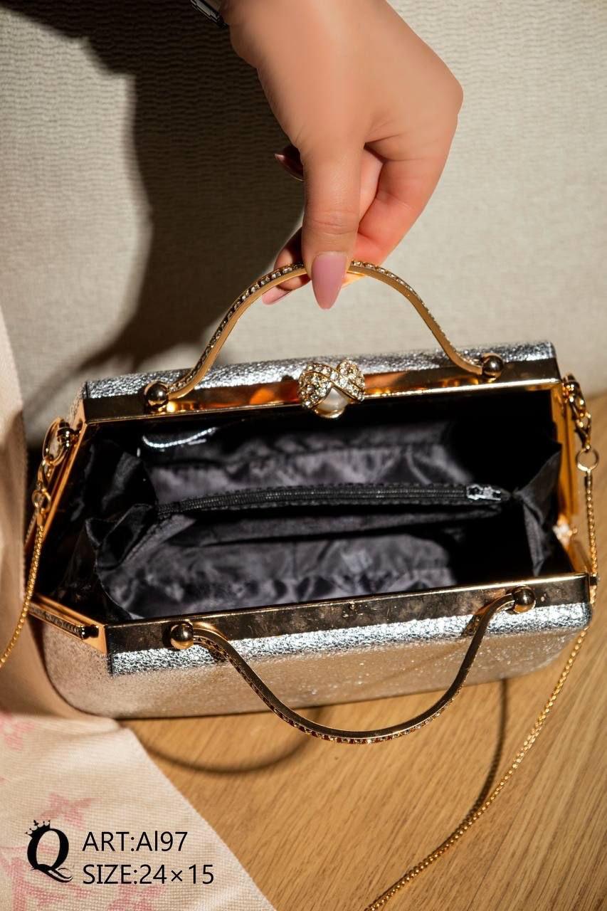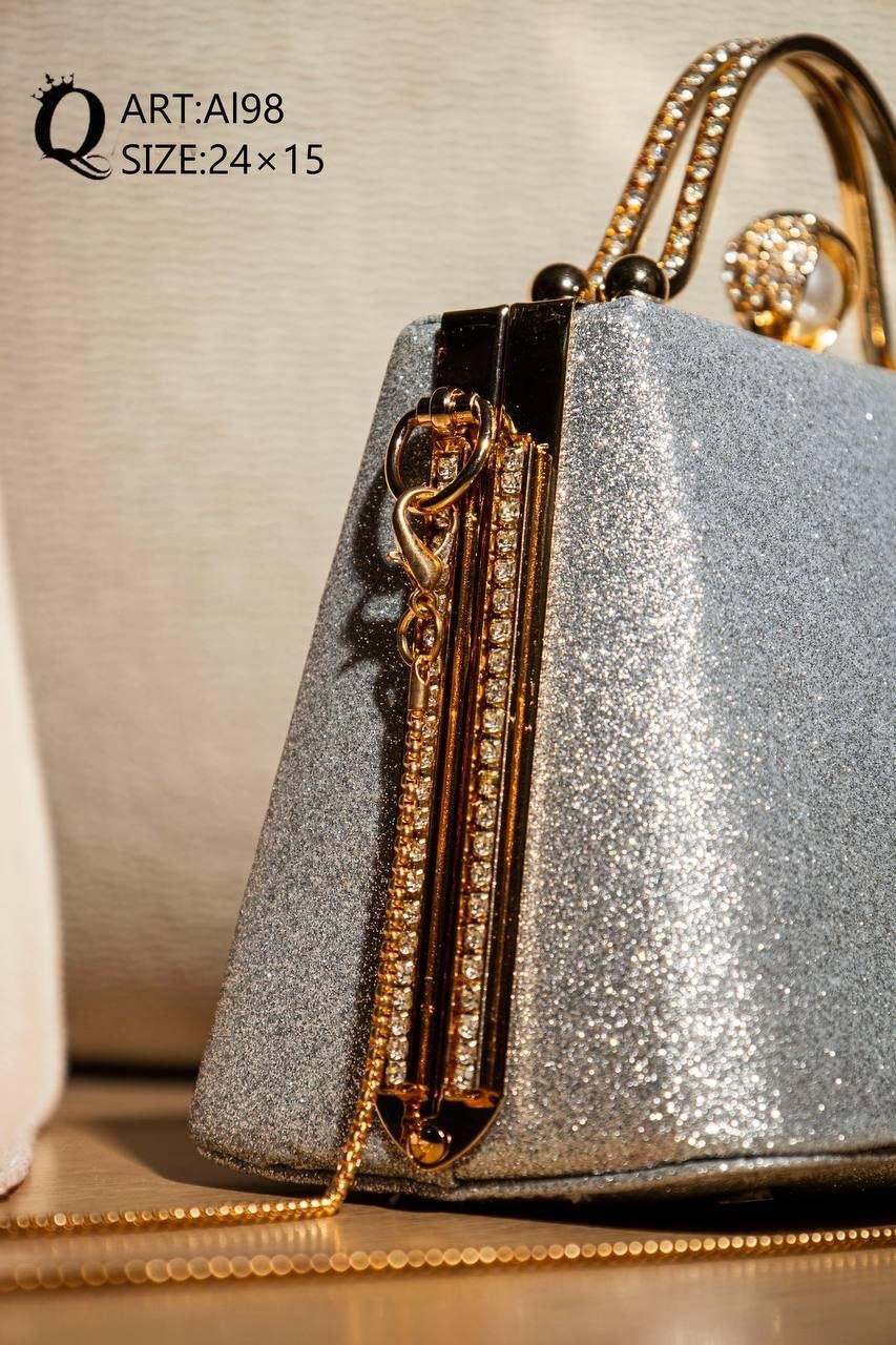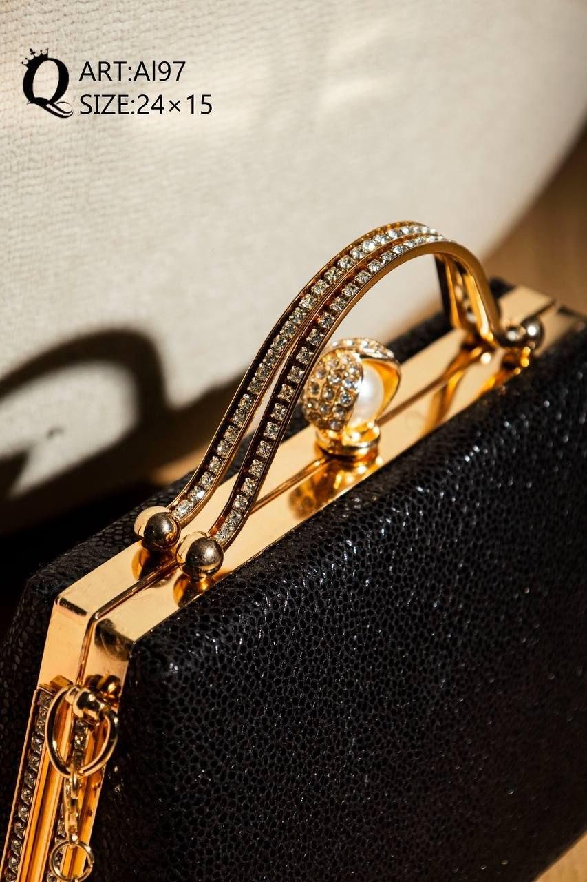 الإطار والمقبض الذهبي مع القفل الكريستالي بيخلوا الشنطة قطعة مميزة تناسب كل المناسبات الراقية.