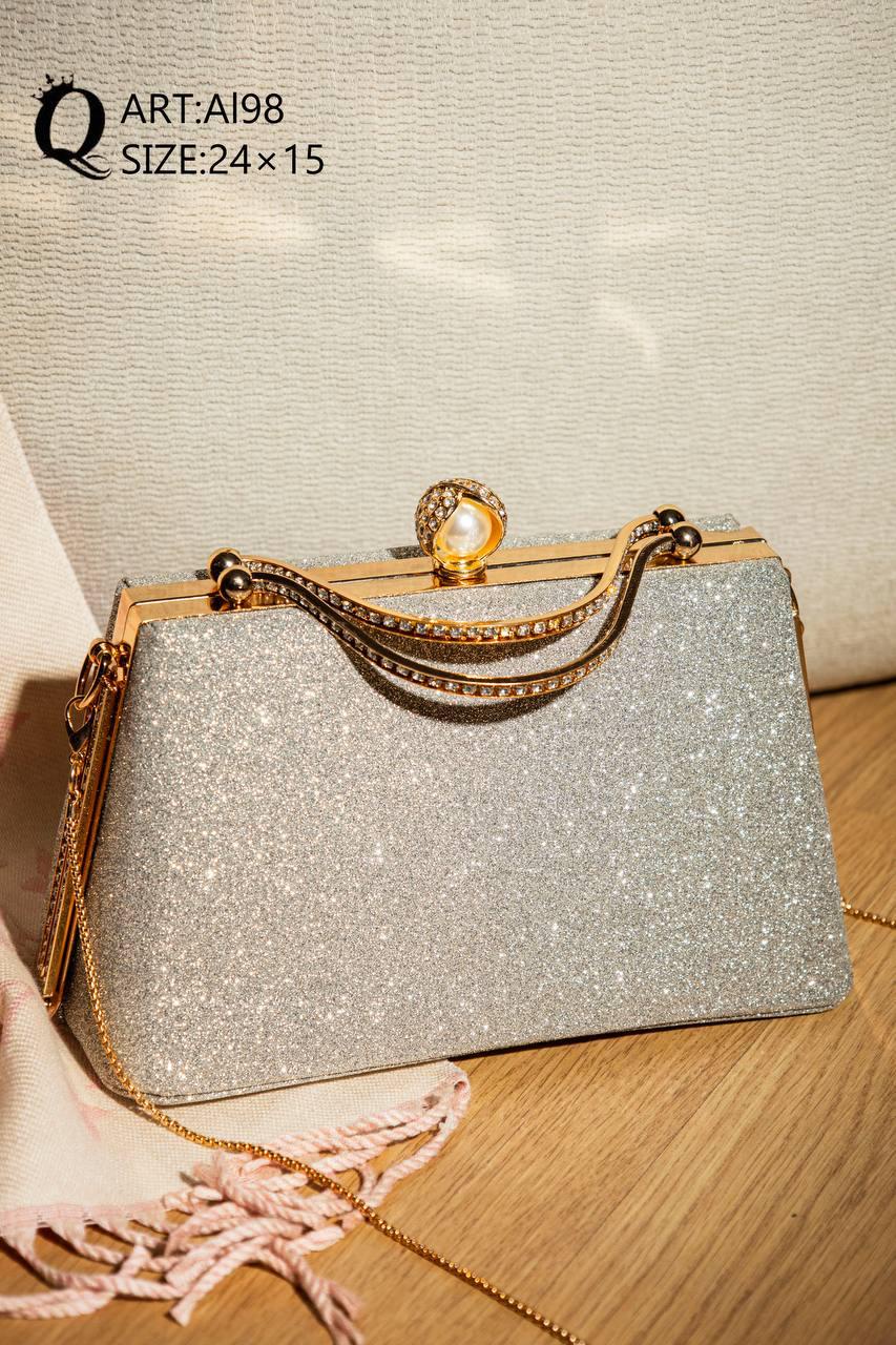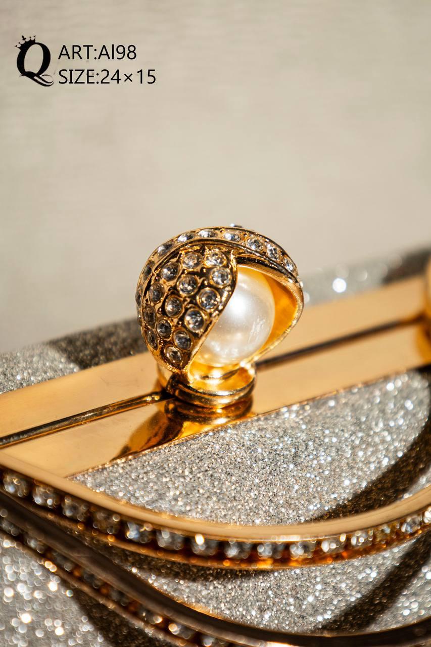 شنطة سواريه أنيقة بتصميم جليتر لامع يضيف لمسة فخامة ورقي لأي إطلالة. تتميز بإطار ومقبض ذهبي راقٍ مع قفل مزين بتفصيلة أنيقة، لتكون اختيار مثالي للسهرات، الأفراح، الخطوبة، والمناسبات الخاصة.